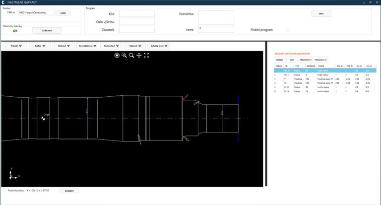 Finální příčný rozměr je součtem hodnot na lineárním pravítku a odchylek na induktivních hlavicích. Jelikož zařízení má čtyři suporty, které současně měří základní a závislé průměry, je možné použít metody plovoucí báze.