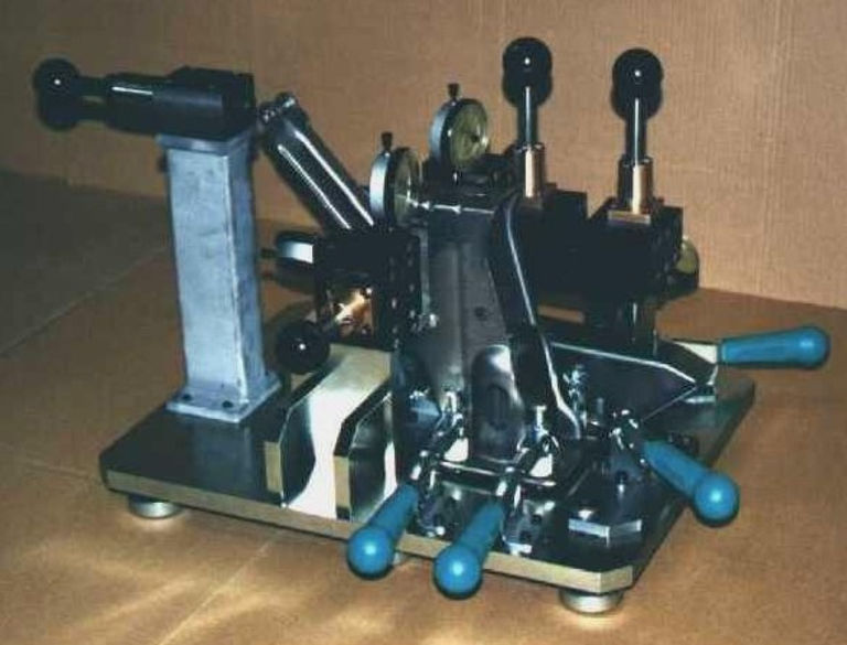 Kontrolní přípravek KP-23 je určen pro kontrolu polohy otvorů kozlíku brzdy pomocí trnů s úchylkoměry a výšky prolisu kozlíku pomocí otočného mezního kalibru. Použity jsou číselníkové úchylkoměry s dělením 0,01 mm.